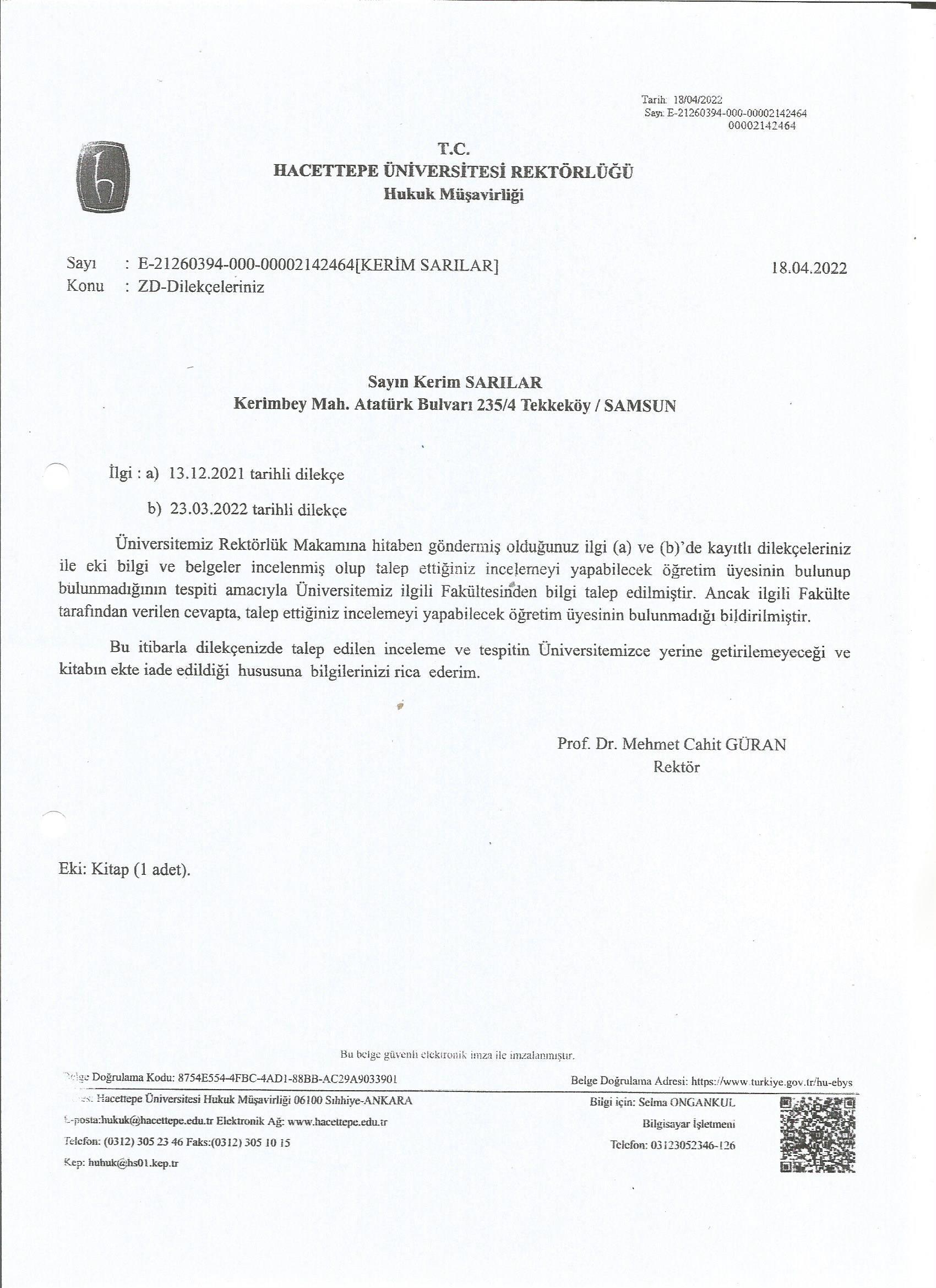 Samsun Medya Gazeteciler Cemiyeti Başkanı, Bilim insanı, Matematikçi Kerim Sarılar Orta öğretimde “Seviye Belirlemesi” ile ilgili talepte bulunduğu TC Hacettepe Üniversitesi Hukuk Müşavirliğinden alınan Rektör Prof. Dr. Mehmet Cahit GÜRAN imzalı yazı ve eki Fen Fakültesi Dekanlığının; “Matematik Bölümünde talep edilen incelemeyi yapabilecek öğretim üyesinin bulunmadığı” şeklinde gelen yazısını inceler incelemez orta öğretimde “Seviye Belirlemesi” ile ilgili talebinin TC Hacettepe Üniversitesi Rektörlüğü Eğitim Fakültesi Matematik ve Fen Bilimleri Eğitimi Bölümü Matematik Eğitimi Ana Bilim Dalı Başkanlığına gönderilmesi gerekirken Fen Fakültesi Dekanlığına gönderildiği görüldü.