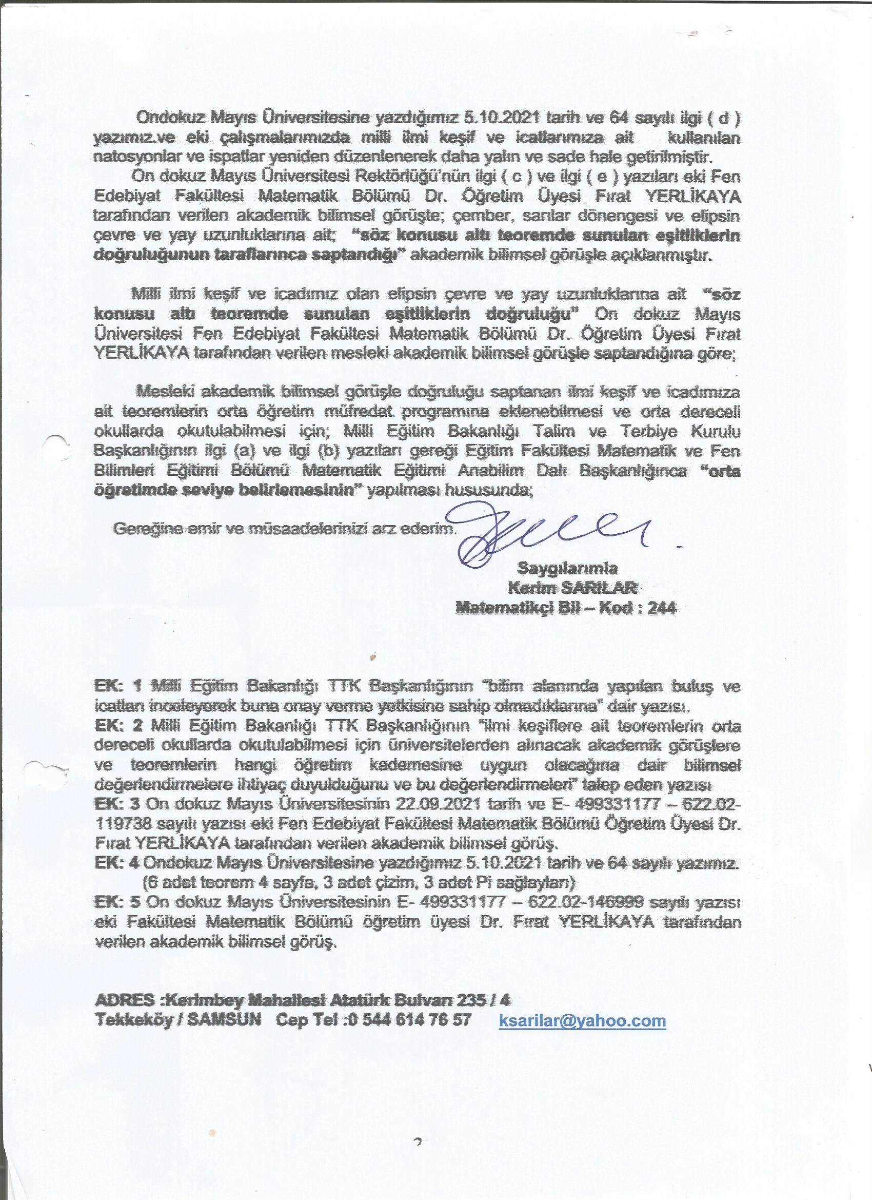 Daha önce On dokuz Mayıs Üniversitesi Fen Edebiyat Fakültesi Matematik Bölümü alan uzmanınca yapılan inceleme ve verilen akademik bilimsel görüşte; çember, sarılar dönengesi ve elipsin çevre ve yay uzunluklarına ait; “Söz konusu altı teoremde sunulan eşitliklerin doğruluğunun taraflarınca saptandığı” akademik mesleki bilimsel görüşle milli ilmi keşfinin doğrulandığını belirten Samsun Medya Gazeteciler Cemiyeti Başkanı, Bilim insanı, Matematikçi Kerim Sarılar şimdi sıra orta öğretimde “Seviye Belirlemesinde” olduğunu açıkladı.