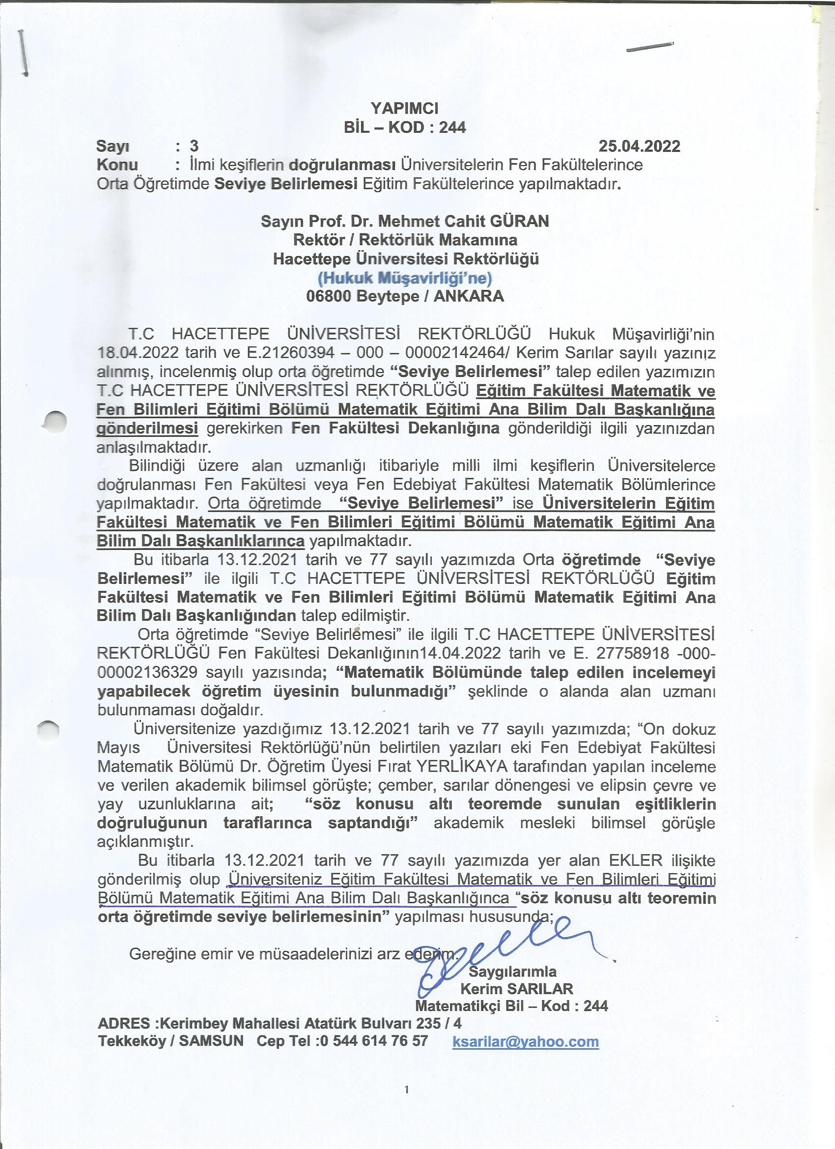 Samsun Medya Gazeteciler Cemiyeti Başkanı, Bilim insanı, Matematikçi Kerim Sarılar Orta öğretimde “Seviye Belirlemesi” ile ilgili talepte bulunduğu TC Hacettepe Üniversitesi Hukuk Müşavirliğinden alınan Rektör Prof. Dr. Mehmet Cahit GÜRAN imzalı yazı ve eki Fen Fakültesi Dekanlığının; “Matematik Bölümünde talep edilen incelemeyi yapabilecek öğretim üyesinin bulunmadığı” şeklinde gelen yazısını inceler incelemez orta öğretimde “Seviye Belirlemesi” ile ilgili talebinin TC Hacettepe Üniversitesi Rektörlüğü Eğitim Fakültesi Matematik ve Fen Bilimleri Eğitimi Bölümü Matematik Eğitimi Ana Bilim Dalı Başkanlığına gönderilmesi gerekirken Fen Fakültesi Dekanlığına gönderildiği görüldü.