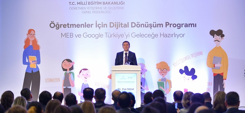Bakan Selçuk, Google işbirliği ile başlatılan "Öğretmenler İçin Dijital Dönüşüm Programı" kapsamında yapılacak çalışmaları, gerçekleştirilen eğitim programlarını ve eğitim içeriklerini, Google yetkilileri ve öğretmenlerin katıldığı törenle kamuoyuna tanıttı. Bakanlık olarak veriden enformasyona, enformasyondan bilgiye, bilgiden bilgeliğe doğru bir yolculuk için çaba gösterdiklerini ifade eden Selçuk, “Bugün, bunu öğretmenler üzerinden yeniden yorumlama zamanı” diye konuştu.