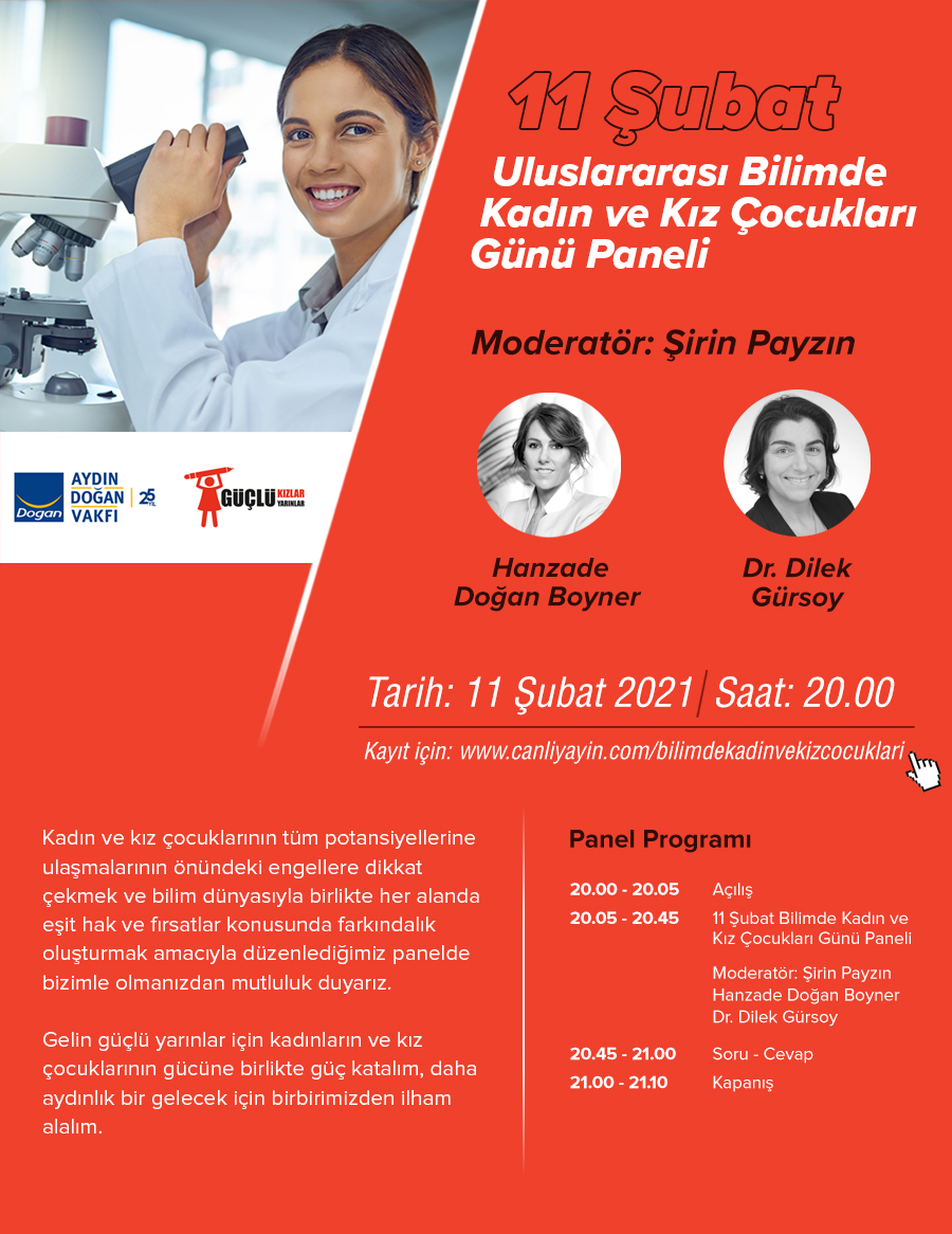Türkiye’de kız çocuklarının tüm potansiyellerine ulaşmalarının önündeki engellere dikkat çekmek için çalışmalarına hız kesmeden devam eden Aydın Doğan Vakfı, 11 Şubat Uluslararası Bilimde Kadın ve Kız Çocukları Günü için değerli isimlerin katıldığı bir panel düzenliyor. Bilim dünyasıyla birlikte her alanda eşit hak ve fırsatlar konusunda farkındalık oluşturmanın amaçlandığı panel, 11 Şubat Perşembe günü, saat 20.00’de www.canliyayin.com/bilimdekadinvekizcocuklari adresinden takip edilebilecek. Almanya’nın en saygın ödüllerinden Victress Ödülü’ne layık görülen Türk Doktor Dilek Gürsoy da panele katılanlardan biri olacak.