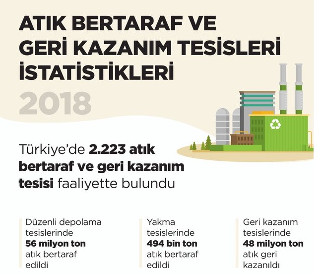 TÜİK, “2018, Atık Bertaraf ve Geri Kazanım Tesisleri İstatistikleri”ni açıkladı. Buna göre, 2018 yılında 166 atık bertaraf tesisi ve 2 bin 57 geri kazanım tesisi olmak üzere toplam 2 bin 223 tesisin faaliyet gösterdiği tespit edildi. Toplam kapasitesi 799 milyon m3olarak tespit edilen 159 düzenli depolama tesisinde 17 milyon tonu tehlikeli olmak üzere 56 milyon ton atık bertaraf edildi.