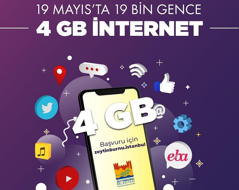 23 Nisan Ulusal Egemenlik ve Çocuk Bayramı’nda ücretsiz olarak 23 bin adet kitap dağıtan Zeytinburnu Belediyesi, 19 Mayıs Gençlik ve Spor Bayramı’nı da unutmayarak ilçede ikamet eden 19 bin gence 4 gb ücretsiz internet servisi hediye ediyor. Ücretsiz internet hizmetinden faydalanmak için 19 Mayıs 2020 tarihinde www.zeytinburnu.istanbul adresinde yayınlanacak formun doldurulması yeterli oluyor.