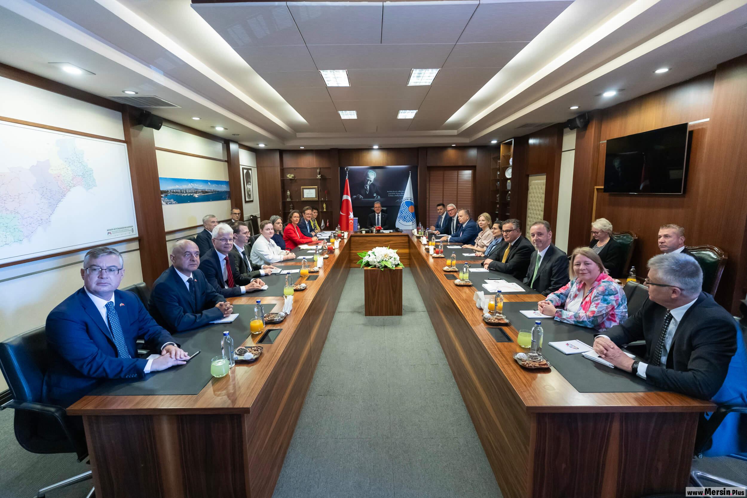 Mersin Büyükşehir Belediye Başkanı Vahap Seçer, Avrupa Birliği (AB) Türkiye Delegasyon Başkanı Büyükelçi Nikolaus Meyer-Landrut başkanlığında Hırvatistan Büyükelçisi Hrvoje Cvitanovic, Fransa Büyükelçisi Isabelle Dumont, Almanya Ticaret Ateşesi Roland Vegh, İtalya Ekonomi Danışmanı Maria De Stefani Spadafora, İrlanda Büyükelçisi John Mccullagh, Letonya Büyükelçisi Pēteris Vaıvars, Litvanya Büyükelçisi Ricardas Degutis, Lüksemburg Maslahatgüzarı Laura Lakaff, Malta Büyükelçisi Theresa Cutajar, Hollanda Maslahatgüzarı Nathalie Lintvelt, Polonya Büyükelçisi Maciej Lang, Portekiz Büyükelçisi Virginia Pina, Romanya Büyükelçisi Stefan Alexandru Tinca, Slovakya Büyükelçisi Jan Psenica, İsveç Büyükelçisi Malena Mard ve AB bürokratlarından oluşan heyet ile bir araya geldi.