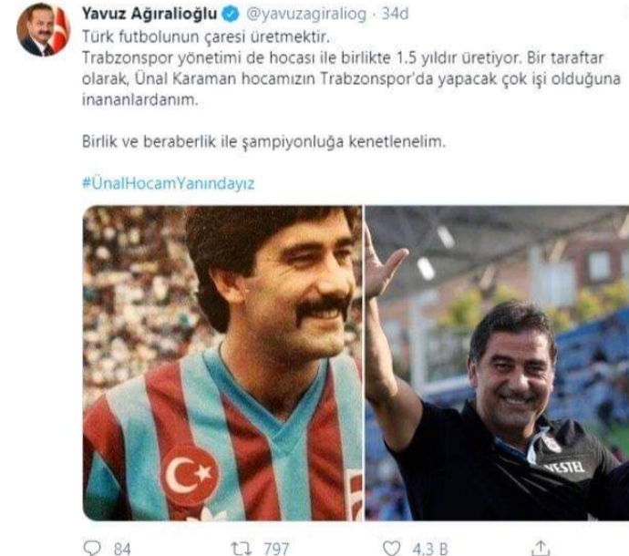 İYİ Parti Sözcüsü Yavuz Ağıralioğlu, Trabzonspor Teknik Direktörü Ünal Karaman'ın takımdan ayrıldığı yönündeki haberlerin çıkması üzerine Twitter hesabından paylaşımda bulunarak birlik çağrısında bulundu.