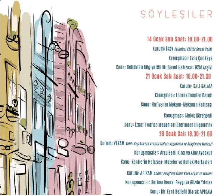 Farklı şehirlerdeki hafıza mekânlarının işlevlerinin üzerinde durulacağı söyleşiler dizisi 14 Ocak'ta “Bellekten Bilgiye Kültür Sanat Hafızası: İKSV” ile başlayacak. Konuşmacı İstanbul Kültür Sanat Vakfı'ndan (İKSV) Esra Çankaya olacak. Söyleşiler dizisinin 21 Ocak'ta iki konuğu olacak. SALT GALATA'dan Lorans Tanatar Baruh “Hafızanın Mekânı Mekânın Hafızası”, akademisyen Prof. Dr. Melek Göregenli “İzmir'i Hafıza Mekânları Üzerinden Düşünmek” üzerine konuşacak. Söyleşiler dizisi 28 Ocak’ta Koç Üniversitesi Vehbi Koç Ankara Araştırmaları Uygulama ve Araştırma Merkezi'nden (VEKAM) Arzu Beril Kırıcı ve Alev Ayaokur’un “Kentlerin Hafızası: Müzeler ve Bellek Merkezleri” söyleşisiyle sürecek. Aynı gün APİKAM Müdürü Dr. Serhan Kemal Saygı ve Uzman Gözde Yılmaz’ın “APİKAM'ın bellek mekânı olarak işlevi” hakkındaki sunumlarıyla da dizi sona erecek.