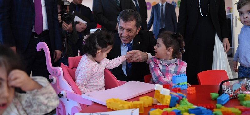 Milli Eğitim Bakanı Ziya Selçuk, Bursa merkez Osmangazi ilçesindeki Şerife Bacı Özel Eğitim Anaokulu'na gelişinde kendisini karşılayan özel çocuklara hediyeler verdi.