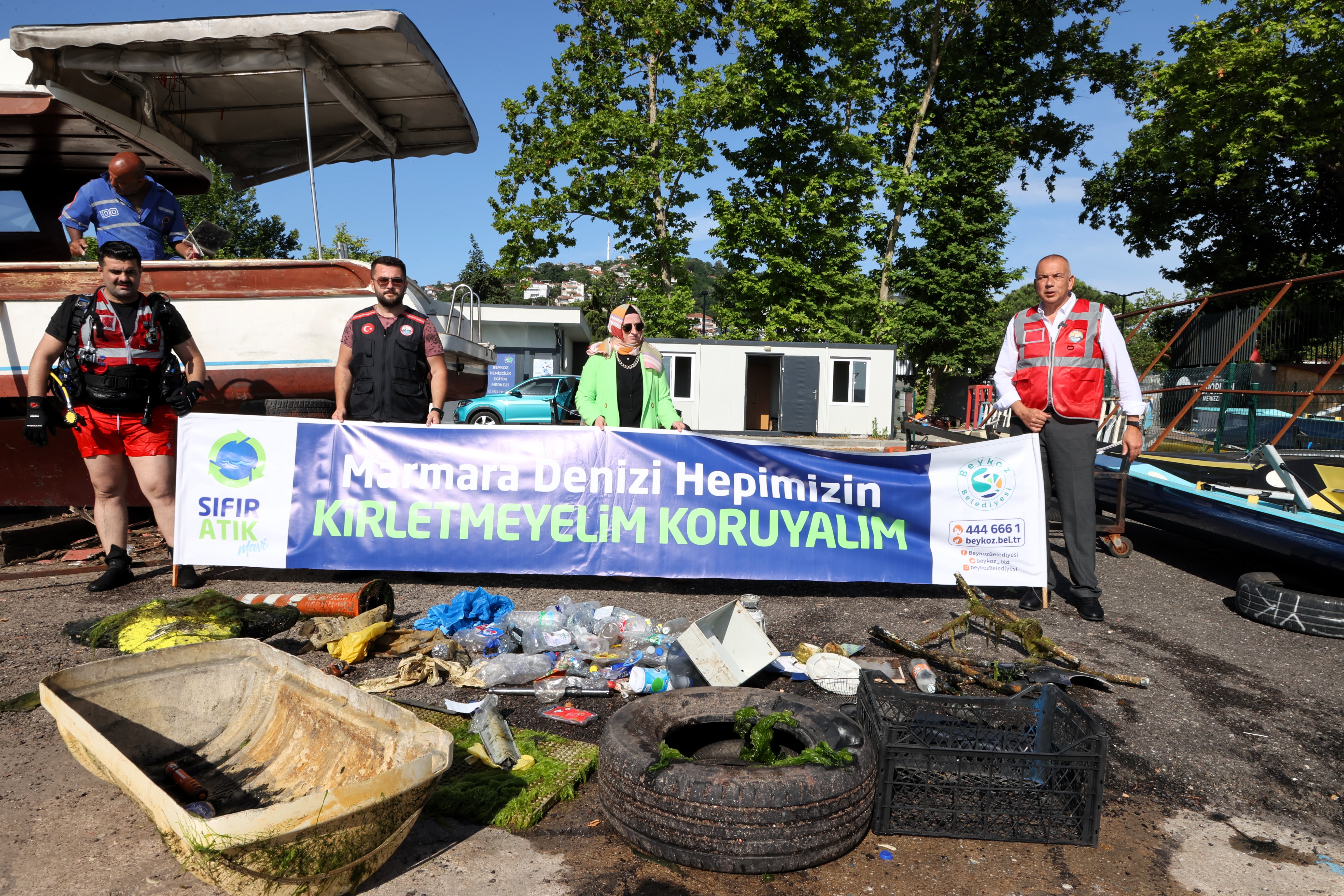 Daha temiz bir çevreye dikkat çekmek için Beykoz’da deniz dip taraması yapıldı. Boğaz’dan çıkan kamyon lastiği, duvar saati, meyve sebze kasaları, duba ve çok sayıda cam ve pet şişe farkındalık için sahilde sergilendi.