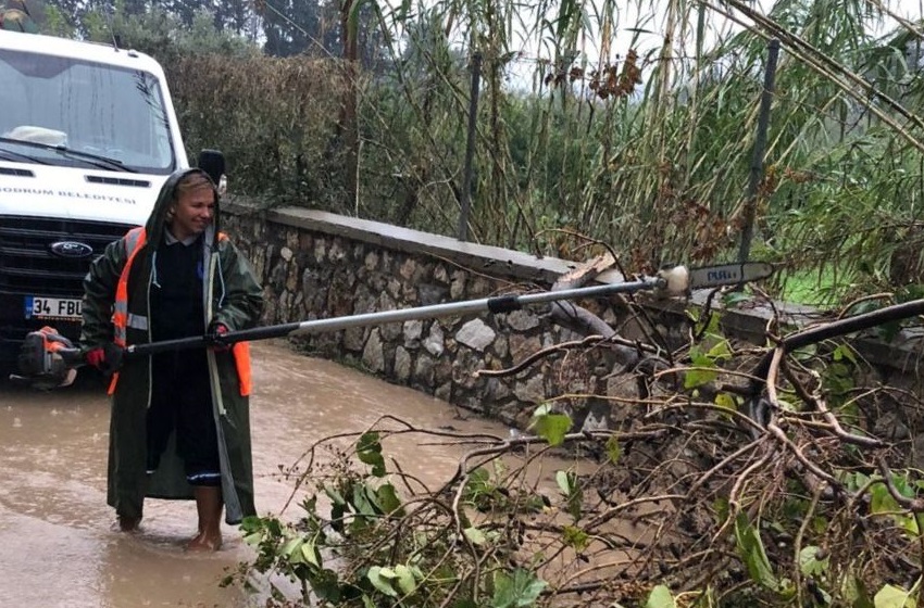 Bodrum Belediye ekipleri, Muğla Büyükşehir Belediyesi başta olmak üzere diğer kurumlarla koordineli şekilde yönlendirmeler gerçekleştirirken kanal açma araçları ve kepçelerle de gerekli görülen bölgelere müdahalede bulunuyor.