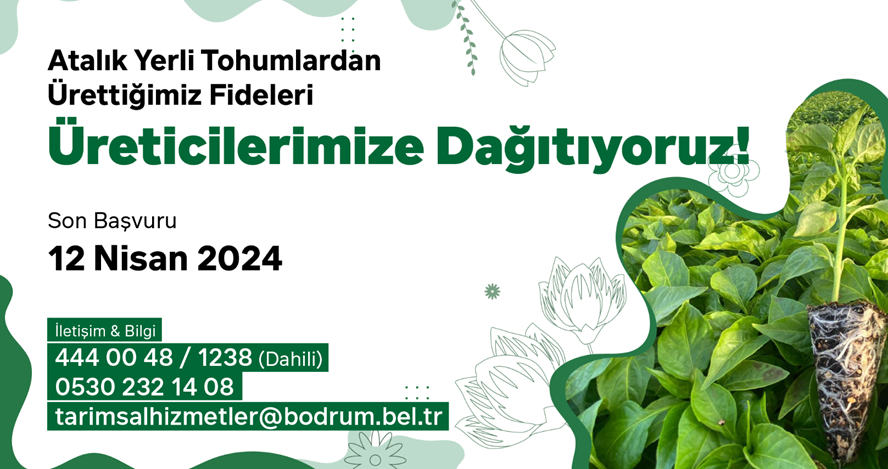 Bodrum Belediyesi Tarımsal Hizmetler Müdürlüğü koordinasyonunda, Bahçeyaka Mahallesinde bulunan Yerel Tohum Merkezi ve Üretim Serasında atalık yerli tohumlardan üretilen fidelerin dağıtımı yapılacak. Fide desteğinden yararlanmak için Tarımsal Hizmetler Müdürlüğüne 12 Nisan Cuma gününe kadar başvurulabiliyor.
