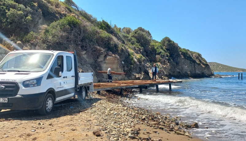 Koyunbaba Mahallesi’nde 125 Ada 12 parselin deniz cephesindeki 60 metrekarelik kaçak ve ruhsatsız iskele ve platform ekiplerin müdahalesi ile kaldırıldı.