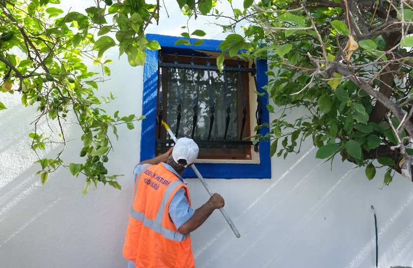 Bodrum'un özgün dokusuna ait olan beyaz badanalı evleri ile mavi kapı ve pencerelerin kentte yaygınlaşması amacıyla gerçekleştirilen çalışmalar kapsamında Bodrum Belediyesi Destek Hizmetleri Müdürlüğü tarafından Bitez Mahallesinde çalışma başlatıldı.