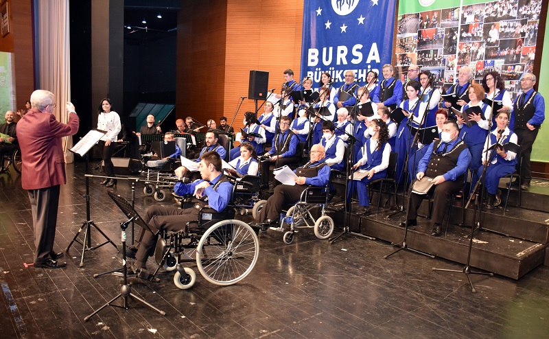 Bursa Kent Konseyi Engelliler Meclisi, 3 Aralık Dünya Engelliler Günü münasebetiyle Atatürk Kongre Kültür Merkezi (Merinos AKKM) Orhangazi Salonu’nda konser düzenledi. Programa Bursa Kent Konseyi Başkanı Şevket Orhan, Bursa Aile, Çalışma ve Sosyal Hizmetler İl Müdürü Muammer Doğan, AK Parti İl Yöneticisi Nurettin Özbağkıran, Büyükşehir Belediyesi Kırsal Hizmetler Dairesi Başkanı Düşünsel Şentürk, Engelliler Meclisi Başkanı İbrahim Sönmez, Bursa Kent Konseyi Yürütme Kurulu üyeleri, belediye bürokratları ve engelli STK’larının temsilcileri katıldı. Gece, saygı duruşu ve İstiklal Marşı’nın hem sesli hem de işaret diliyle okunmasıyla başladı. Açılışın ardından 18 yıldır faaliyetlerini sürdüren ve 45 kişiden oluşan Türk Halk Müziği ekibi, Koro Şefi Kemal Kamalı önderliğinde sahne aldı. Orkestra Şube Müdürlüğü sanatçılarının da enstrümanlarıyla yer aldığı gecede, engelliler ‘Deniz Üstü Köpürür’, ‘Değmen Benim Gamlı Yaslı Gönlüme’ ve ‘Meşeli Dağlar’ gibi birçok eseri solo ve koro halinde seslendirdi. Dinleyenlere müzik ziyafeti çektiren koro, salonu dolduranlara zaman zaman eğlenceli zaman zaman da duygusal anlar yaşattı. Sanatla engelleri aşan gönüllü koristler, performanslarıyla hem kendileri hem de aileleri için moral depoladı.