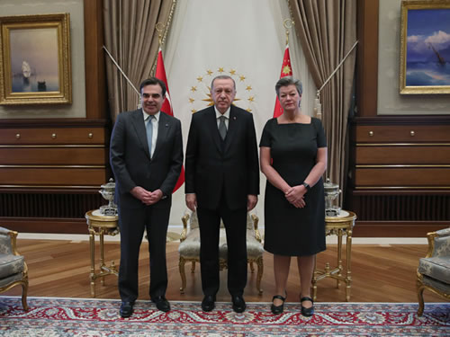 Cumhurbaşkanlığı’ndan edinilen bilgiye göre, Cumhurbaşkanı Recep Tayyip Erdoğan, Avrupa Birliği (AB) Komisyonu Başkan Yardımcısı Margaritis Schinas ve AB İçişlerinden Sorumlu Komisyon Üyesi Ylva Johansson’u, Cumhurbaşkanlığı Külliyesi’nde kabul etti. Kabulde; Cumhurbaşkanı Yardımcısı Fuat Oktay ve İçişleri Bakanı Süleyman Soylu da hazır bulundu.