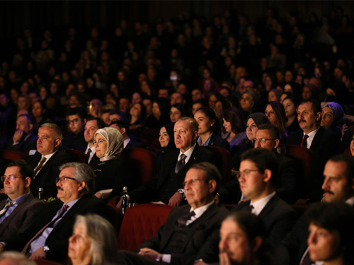Cumhurbaşkanı Erdoğan'a eşi Emine Erdoğan’ın eşlik ettiği programda; Cumhurbaşkanı Yardımcısı Fuat Oktay, Kültür ve Turizm Bakanı Mehmet Nuri Ersoy, Sanayi ve Teknoloji Bakanı Mustafa Varank, Danıştay Başkanı Zerrin Güngör ile Sayıştay Başkanı Seyit Ahmet Baş da oyunu izledi.