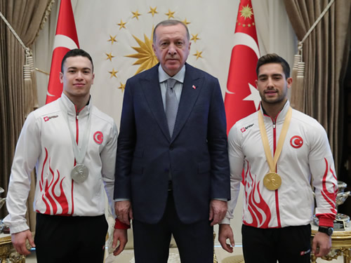 Erdoğan, milli jimnastikçiler Ahmet Önder ve İbrahim Çolak'ı Cumhurbaşkanlığı Külliyesinde kabul etti. Kabulde, Gençlik ve Spor Bakan Yardımcısı Hamza Yerlikaya da hazır bulundu.