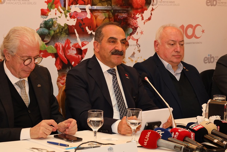 Ege Yaş Meyve Sebze İhracatçıları Birliği Basın Toplantısı, Ege İhracatçı Birlikleri Koordinatör Başkan Yardımcısı Ege Yaş Meyve Sebze İhracatçıları Birliği Yönetim Kurulu Başkanı Hayrettin Uçak, Ege İhracatçı Birlikleri Koordinatör Başkanı Jak Eskinazi, Ege Su Ürünleri ve Hayvansal Mamuller İhracatçıları Birliği Başkanı Bedri Girit, Ege Yaş Meyve Sebze İhracatçıları Birliği Yönetim Kurulu Başkan Yardımcısı Cengiz Balık, Ege Yaş Meyve Sebze İhracatçıları Birliği Yönetim Kurulu Başkan Yardımcısı Ege Yaş Meyve Sebze İhracatçıları Birliği Yönetim Kurulu Üyesi Sadık Demircan, Ege Yaş Meyve Sebze İhracatçıları Birliği Yönetim Kurulu Üyesi Kenan Unat, Ege Yaş Meyve Sebze İhracatçıları Birliği Yönetim Kurulu Üyesi Vildan Akgedik, Ege Yaş Meyve Sebze İhracatçıları Birliği Yönetim Kurulu Yedek Üyesi Ahmet Altubay, Ege Yaş Meyve Sebze İhracatçıları Birliği Denetim Kurulu Yedek Üyesi Ahmet Kaymaz, Ege Yaş Meyve Sebze İhracatçıları Birliği Yönetim Kurulu Yedek Üyesi Aydın Akyüzlü, Ege Yaş Meyve Sebze İhracatçıları Birliği Yönetim Kurulu Yedek Üyesi Berna Akyüzlü katılımıyla gerçekleştirildi.