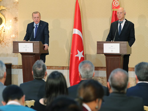 Cumhurbaşkanı Erdoğan, Tunus Cumhurbaşkanı Kays Said ile birlikte, Cumhurbaşkanlığı Sarayı'nda gerçekleştirdikleri baş başa ve heyetler arası görüşmenin ardından ortak basın toplantısı düzenledi. Tunus Cumhurbaşkanı Said'in göreve başlamasından bu yana Tunus'u ziyaret eden ilk cumhurbaşkanı olmaktan duyduğu memnuniyeti dile getiren Erdoğan, Tunus Cumhurbaşkanı Said'i bu göreve yüzde 70 oy alarak seçilmesinden dolayı kutladı, başarılar diledi.