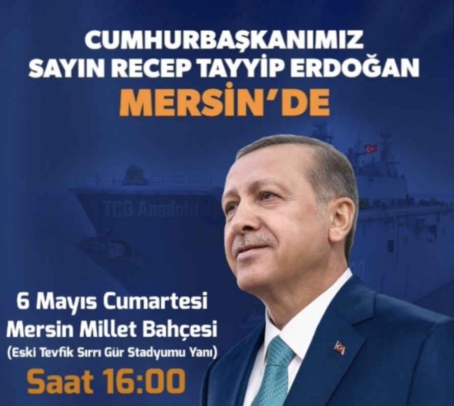 Bir özel TV’de katıldığı canlı yayındaki proğramda rahatsızlanan Recep Tayyip Erdoğan’ın Mersin proğramı ertelenmişti.6 Mayıs Cumartesi günü Mersin’de saat 16:00 da Millet Bahçesinde halka hitap edecek olan Erdoğan’ın Mersinlilere neler vaat edeceği merak ediliyor…