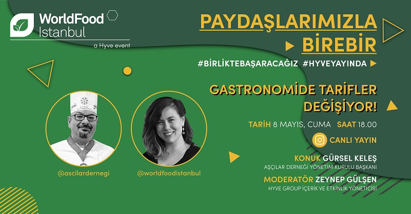 8 Mayıs, Cuma günü saat 18:00’de, WorldFood İstanbul Instagram hesabı worldfoodistanbul sayfasında Hyve Group İçerik ve Etkinlik Yöneticisi Zeynep Gülşen yönetiminde gerçekleştirilecek canlı yayında “Gastronomide Tarifler Değişiyor!” konusu konuşulacak.