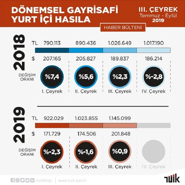 TÜİK, “III. Çeyrek: Temmuz - Eylül, 2019 Dönemsel Gayrisafi Yurt İçi Hasıla” verilerini açıkladı. Buna göre, üretim yöntemiyle Gayrisafi Yurt İçi Hasıla tahmini, 2019 yılının üçüncü çeyreğinde cari fiyatlarla %11,5 artarak 1 trilyon 145 milyar 99 milyon TL oldu.