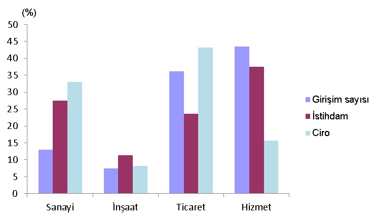 TÜİK, 2018 yılı “Yıllık Sanayi ve Hizmet İstatistikleri”ni açıkladı. Buna göre, ticaret sektörü ciroda %43,2'lik pay ile ilk sırada yer aldı. Girişimlerin en fazla yer aldığı ve istihdam payı en yüksek olan hizmet sektörünün ciro payı %15,7 iken sanayi sektörünün ciro payı %33 oldu.