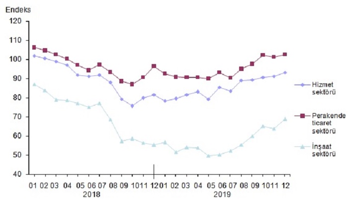 TÜİK, “Aralık 2019, Sektörel Güven Endeksleri”ni açıkladı. Buna göre, hizmet sektöründe bir önceki aya göre; iş durumu, hizmetlere olan talep ve hizmetlere olan talep beklentisi endeksleri sırasıyla %0,6, %1,9 ve %3,4 artarak 89,8, 89,3 ve 100,5 değerlerini aldı.