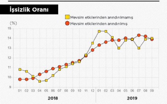 TÜİK, “Eylül 2019, İşgücü İstatistikleri”ni açıkladı. Buna göre, işsizlik oranı 2,4 puanlık artış ile %13,8 seviyesinde gerçekleşti. Aynı dönemde; tarım dışı işsizlik oranı 2,9 puanlık artış ile %16,4 olarak tahmin edildi. Genç nüfusta (15-24 yaş) işsizlik oranı 4,5 puanlık artış ile %26,1 olurken,15-64 yaş grubunda bu oran 2,4 puanlık artış ile %14,1 olarak gerçekleşti.