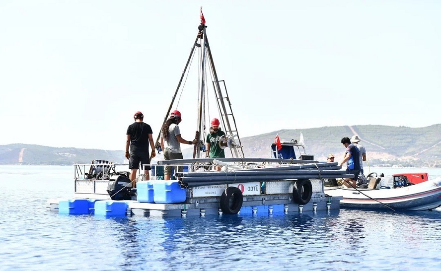 araştırmasını sürdürüyor. ODTÜ Deniz Paleosismolojisi Araştırma ekibi tarafından ODTÜ’ye ait sondaj platformuyla Gümüldür’ün yaklaşık 2,5 kilometre açığında deniz tabanından karot örneği alınıyor.