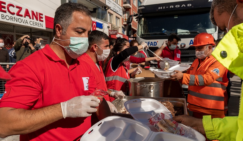 Enkaz altında kalan vatandaşları kurtarma çalışmaları devam ederken Türk Kızılay’ın ülkenin çeşitli bölgelerinden İzmir’e gelen afet uzmanları, gönüllüler ve şubeler depremden etkilenen vatandaşlarımıza hizmet etmeye devam ediyor. Depremzedelere bir yandan 3 öğün yemekle beslenme hizmeti veren Kızılay ekipleri, diğer yandan da battaniye, su, maske, hijyen, dezenfektan, ikramlık gibi malzemelerle gece gündüz ihtiyaçları karşılıyor. Kızılay’ın, psikososyal destek ekipleri de depremin ruhsal etkilerini azaltmaya yardımcı oluyor.