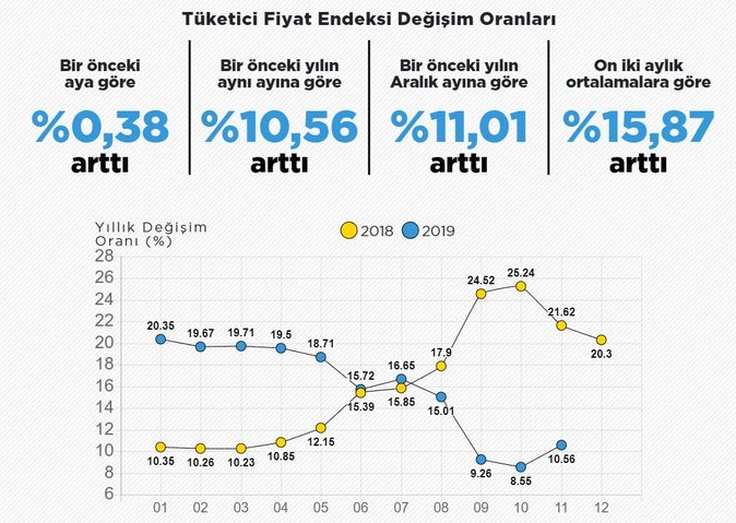 TÜİK, “Kasım 2019, Tüketici Fiyat Endeksi”ni açıkladı. Buna göre, aylık en yüksek artış %2,69 ile giyim ve ayakkabı grubunda oldu. Ana harcama grupları itibarıyla 2019 yılı Kasım ayında endekste yer alan gruplardan, ev eşyasında %0,59, haberleşmede %0,39, konutta %0,36 ve ulaştırmada %0,33 artış gerçekleşti.