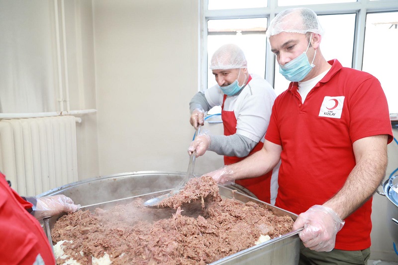 Depremzede vatandaşların olumsuz şartlardan korunması için ihtiyaç duyulan yardım malzemelerini bölgeye sevk eden Kızılay, yaklaşık 5 biner kişiye sıcak yemek dağıtımı yapabilecek kapasiteye sahip mobil mutfakları ise Erzurum, Erzincan, Muş ve Adana’dan deprem bölgesine kısa sürede ulaştırdı. Sıcak yemek üretimine başlayan Kızılay ekipleri, afetzedelerin yemek ihtiyacını da karşılamaya başladı.