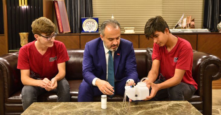 Her yıl çevre, sağlık, enerji ve mühendislik branşlarında yapılan Uluslararası Bilim Proje Olimpiyatının çevre kategorisinde birinci olan Uluslararası Murat Hüdavendigar Anadolu İmam Hatip Lisesi öğrencileri Abdülkerim Karabulut ve Serdar Aşkın, Başkan Alinur Aktaş’ı ziyaret etti. Arabalarda yüzde 40’a varan yakıt tasarrufu sağlayan ve ‘akaryakıt tasarruf makinesi’ adını verdikleri buluşlarını da yanlarında getiren liseli gençler, aracın hava filtresine monte edilen cihazın bor katkılı özel bir karışımla nasıl tasarruf sağladığını Başkan Aktaş’a anlattı. Kazandıkları birincilikle Kasım ayında Meksika’da yapılacak bilim olimpiyatlarında Türkiye’yi temsil edecek olan Abdülkerim Karabulut ve Serdar Aşkın’ı tebrik eden Başkan Aktaş, kendisinden manevi destek beklediklerini söyleyen liselilerin yanında olduklarını söyledi.