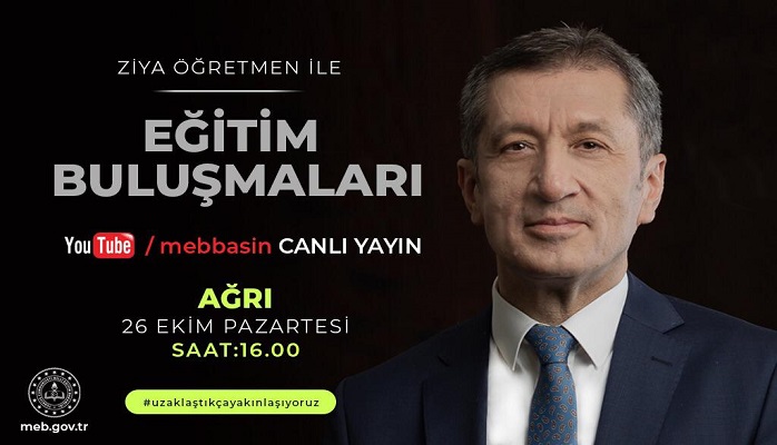 Milli Eğitim Bakanı Prof. Dr. Ziya Selçuk, "Ziya Öğretmen ile Eğitim Buluşmaları" ile Pazartesi video konferans yöntemi ile Ekim 2020 günü Saat: 16.00'da Ağrı il genelinde görev yapan öğretmenlerle bir araya gelecek. Buluşma, youtube.com/mebbasin adresinden canlı yayınlanacak.