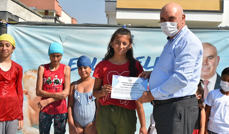 Covid-19 salgını nedeniyle geç başlayan yüzme kursunu başarıyla tamamlayan minik yüzücüler sertifikalarını Karaisalı Belediye Başkanı Saadettin Aslan’ın elinden aldılar.