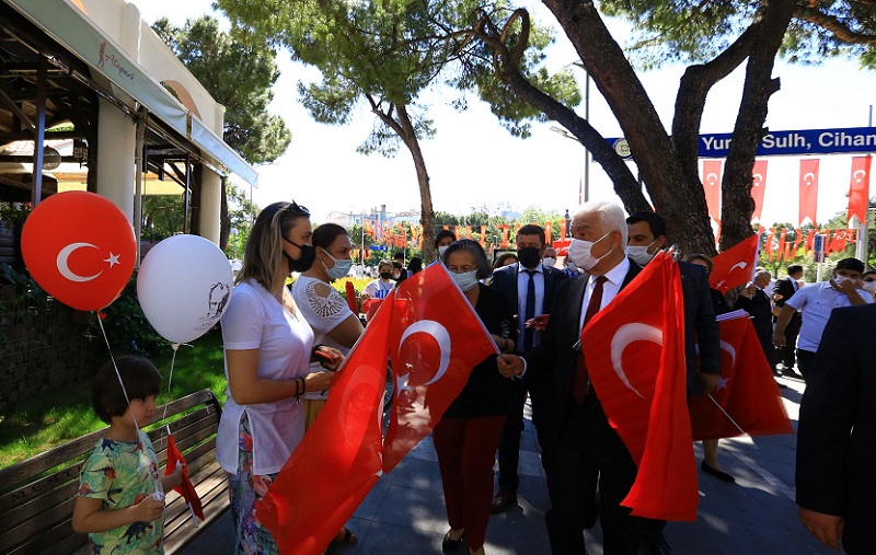 Muğla’nın Menteşe ilçesi Cumhuriyet Meydanı Atatürk Anıtı’nda 19 Mayıs Atatürk’ü Anma, Gençlik ve Spor Bayramı’nın 102’nci yıl dönümü coşkuyla kutlandı. Muğla Büyükşehir Belediye Başkanı Dr. Osman Gürün, kutlamalarını daha renkli hale getirmek adına ev ve iş yerlerine Türk Bayrağı dağıttı.