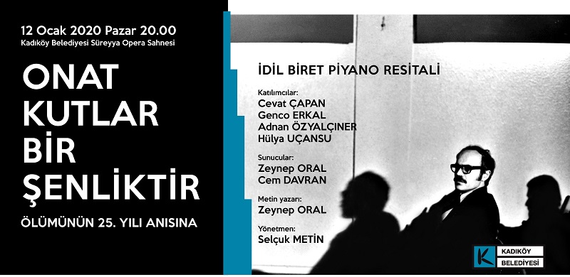 11 Ocak 1995’te uğradığı bombalı saldırı sonucu 59 yaşında hayatını kaybeden şair, yazar, sinema eleştirmeni ve Türk Sinematek Derneği kurucularından Onat Kutlar anısına düzenlenen gece Kadıköy Belediye Başkanı Şerdil Dara Odabaşı’nın açılış konuşmasıyla başlayacak. “Onat Kutlar Bir Şenliktir” anma programında Hülya Uçansu, Adnan Özyalçıner, Türk Sinematek Derneği kurucularından Cevat Çapan konuşma yapacak ve sanatçı Genco Erkal Kutlar’ın eserlerinden bölümler okuyacak. Zeynep Oral ile Selçuk Metin’in hazırladığı; Zeynep Oral ve Cem Davran’ın sunuculuğunu yaptığı gece piyanist İdil Biret’in vereceği resitalle son bulacak.