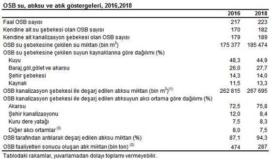 TÜİK, 2018 “Organize Sanayi Bölgeleri Su, Atıksu ve Atık İstatistikleri”ni açıkladı. Organize Sanayi Bölgeleri (OSB) Su, Atıksu ve Atık İstatistikleri Anketi kapsamında faal olan 223 Organize Sanayi Bölgesi Müdürlüğü'nden elde edilen sonuçlara göre, 2018 yılında su şebekesi ile dağıtılmak üzere 185 milyon m3 su çekildi. Çekilen suyun %44,9'u kuyulardan, %27,7'si baraj, göl, gölet ve akarsulardan, %14'ü şehir şebekelerinden, %13,3'ü ise kaynaklardan çekildi. OSB kanalizasyon şebekelerinden 2018 yılında toplam 268 milyon m3 atıksu deşarj edildi. Atıksuyun %75,8'i akarsuya, %8,4'ü şehir kanalizasyonuna, %8,3'ü kuru dere yatağına, %7,5'i ise diğer alıcı ortamlara deşarj edildi.