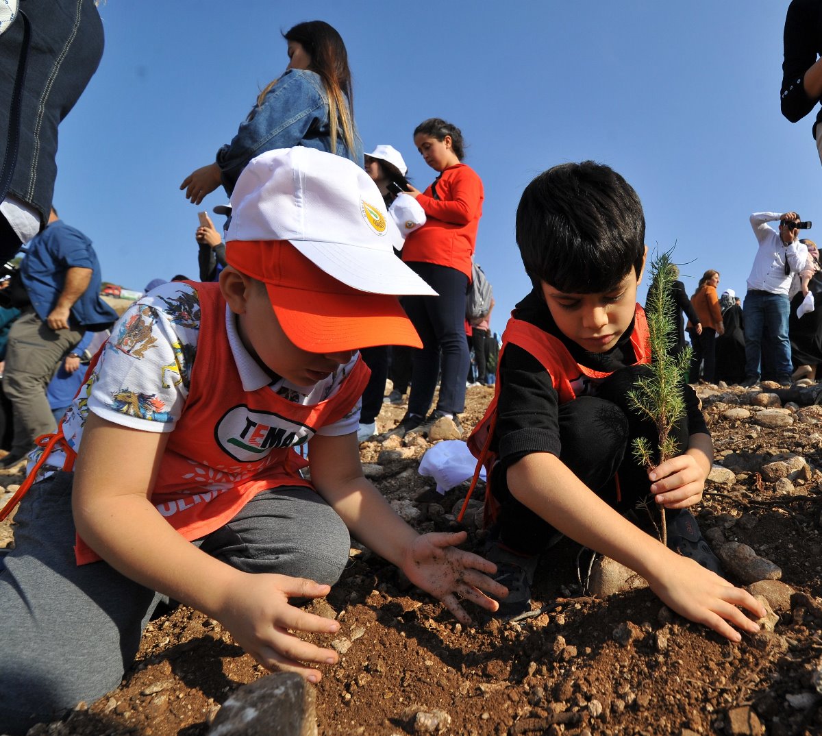 Protokol mensuplar, öğrenciler ve vatandaşlarımız da fidanları toprakla buluşturarak kampanyaya destek verdiler.