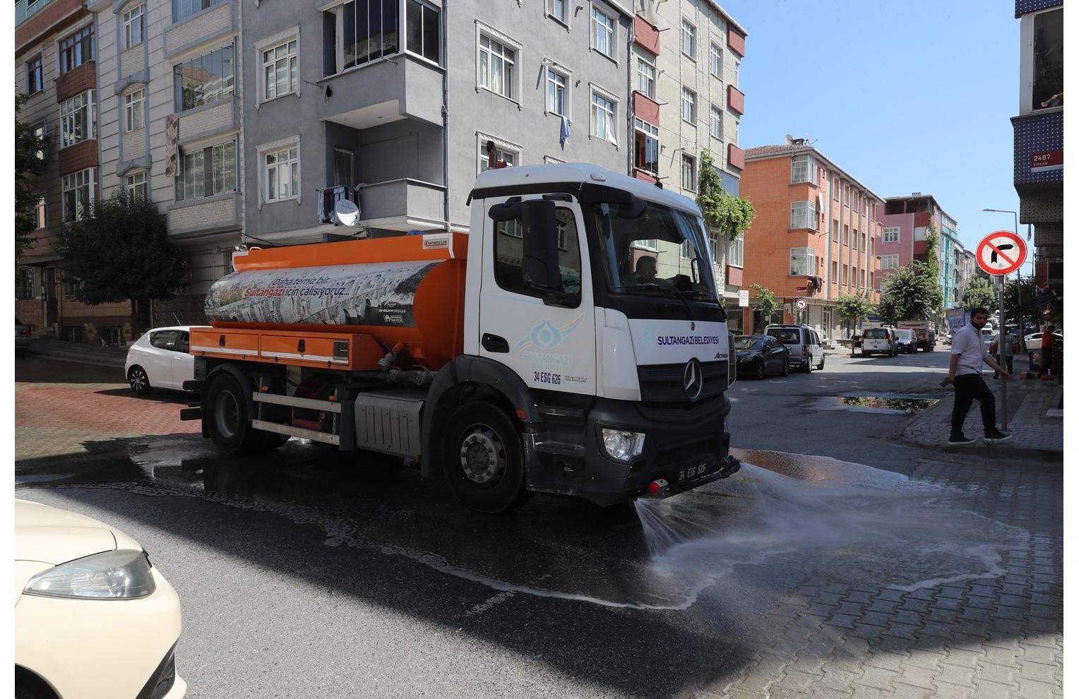 Sultangazi Belediyesi, temiz bir Sultangazi için yoğun bir çalışma yürütüyor. Ekipler, günlük rutin temizliklerine devam ederken cadde ve sokaklar hizmet araçlarıyla yıkanıyor.