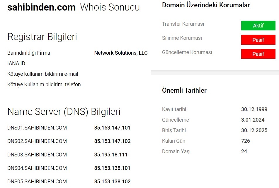 www.sahibinden.com için Whois Sorgulama yapıldığında aşağıdaki bilgilere ulaşılmaktadır.