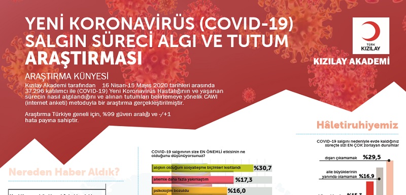 TÜRK Kızılay bünyesinde faaliyetlerine başlayan Kızılay Akademi Başkanlığı, pandeminin tüm boyutlarıyla yaşandığı Mayıs ayında Covid-19’un toplumda nasıl bir etki yarattığına ilişkin online anket uygulaması gerçekleştirdi. 81 ilde 37 bin kişi ile internet ortamında gerçekleştirilenve bu yanıyla Türkiye’nin en geniş kapsamlı çalışması olan “Covid-19 Algı ve Tutum Araştırması”nın sonuçları açıklandı. Araştırmaya katılan kişiler, “Ben biliyor ve önlem alıyorum ama toplumun yüzde 50’ye yakını hastalığı bilmiyor ve önlem almıyor” görüşünde.