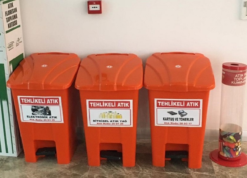 Ana hizmet binamızın personel girişinin kısıtlı ve kontrollü olduğu -2 inci katına yönetmelikçe zorunlu tutulan Atık Geçici Depolama Alanı tesis edildi. Bu alanda çalışanlarımızın oluşturduğu evsel atıkların ve geri dönüşümü mümkün olan atıkların ayrı konteynerlerda geçici olarak depolanması sağlandı. Buna ek olarak kurumumuzun faaliyetlerinden kaynaklanan “Tehlikeli Atıkların” geçici olarak depolanması için de özel korunaklı bir alan yapıldı. Bu alanda bitkisel atık yağlar, atık piller, floresanlı aydınlatma ekipman atıkları ve toner/kartuş atıkları geçici olarak depolandı. Böylelikle yeni kurulan sıfır atık yönetim sistemi sayesinde kurumumuzda oluşan atıkların öncelikle kaynağında ayrılması sağlanmış oldu.