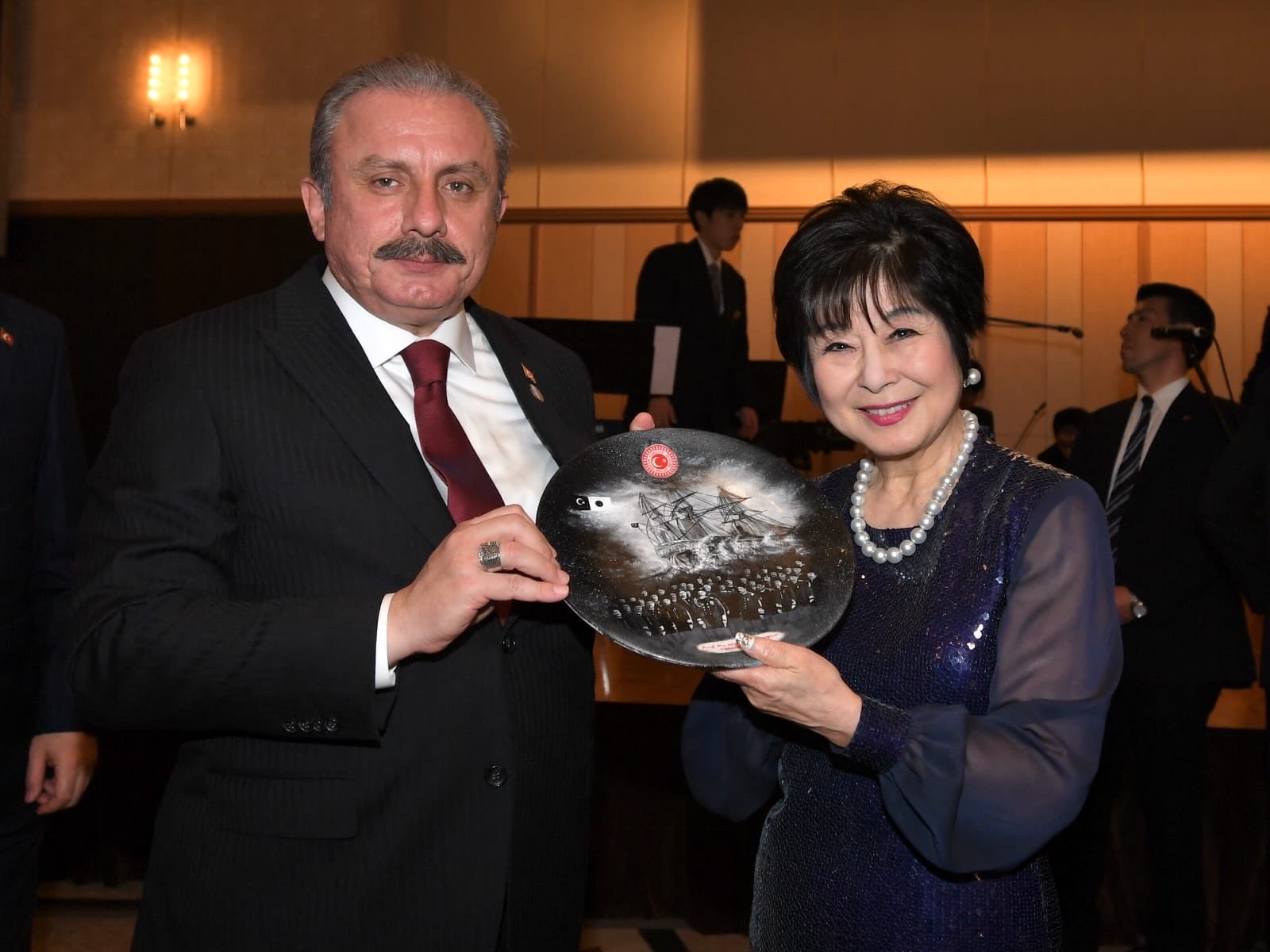 e-Haber Ajansı (e-ha) editörünün kaynakağından yönlendirildiği sırada; TBMM Başkanı Prof. Dr. Mustafa Şentop, Japonya Danışma Meclisi Başkanı Akiko Santo'ya Ertuğrul Fırkateyni ve Osmanlı askerlerinin tasviri bulunan bir çini tabak hediye etti.