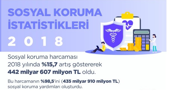 Sosyal koruma harcamalarının gayri safi yurtiçi hasıla (GSYH) içindeki payı 2018 yılında %11,9 oldu. Sosyal koruma yardımlarının GSYH içindeki payı ise %11,7 olarak gerçekleşti. Risk/ihtiyaç grupları bazında bakıldığında, emekli/yaşlılara yapılan harcamaların %5,7 ile en büyük paya sahip olduğu görüldü. Bunu, %3,3 ile hastalık/sağlık bakımı harcamaları ve %1,4 ile dul/yetim harcamaları takip etti.