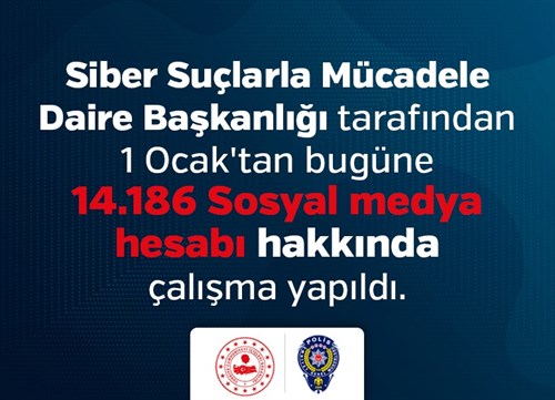 Sosyal mecrada gelişen gündem ve konular, çeşitli illegal örgüt ve gruplara müzahir sosyal medya hesapları/siteleri yakından takip edilmekte olup 1 Ocak 2020 tarihinden itibaren terör örgütü propagandası yapan, halkı kin ve düşmanlığa tahrik veya aşağılayan, toplumu korku ve paniğe sürükleyen, yalan belge yayınlayarak algı operasyonu ve provokatif paylaşımı yapan toplam 14 bin 186 hesap hakkında çalışma yapıldı.