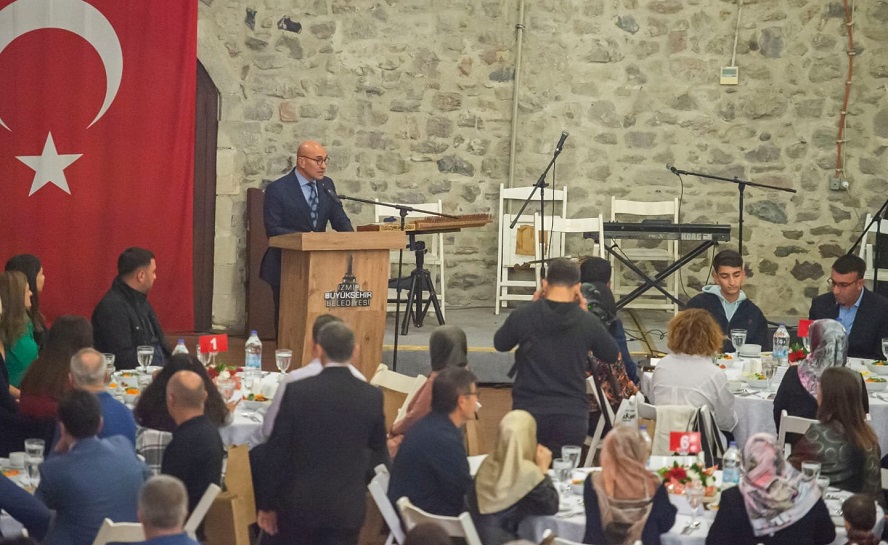 Peygamberimiz Hazreti Muhammed’in “Kolaylaştırınız, zorlaştırmayınız. Müjdeleyiniz, nefret ettirmeyiniz” hadis-i şerifinin dinimizi özetleyen bir cümle olduğunu belirten Başkan Soyer, “İki kısa cümleye bir deryayı sığdırmayı başaran bu sözlere yaşadığımız çağda her şeyden çok ihtiyaç duyuyoruz. Bu hadis-i şerif, insanlık var olduğu sürece hayat yolumuzu aydınlatmaya devam edecek. Değerli çalışma arkadaşlarım sizler, çok kutsal ve bir o kadar da zor bir görevi yerine getiriyorsunuz. Üstün erdemlerinizle ifa ettiğiniz görevler sayesinde, dinimizin öğütlediği hoşgörü, dayanışma ve sevgiyi yaşatabiliyoruz. Kul hakkına sizlerin destekleriyle sahip çıkıyor, maneviyatımızı sizlerle koruyoruz. Savaşın, yoksulluğun ve afetlerin dünyamızdan bir gün dahi eksik olmadığı zor zamanlardan geçiyoruz. Biliyorum ki iyilik ve hoşgörü yolunu terk ederek, bunca yükü omuzlayabilmemiz asla mümkün değil” şeklinde konuştu.