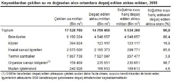 TÜİK, “2018, Sektörel Su ve Atıksu İstatistikleri”ni açıkladı. Buna göre, belediyeler, köyler, imalat sanayi işyerleri, termik santraller, organize sanayi bölgeleri (OSB) ve maden işletmeleri tarafından 2018 yılında 17,5 milyar m3 su doğrudan su kaynaklarından çekildi. Su kaynaklarından çekilen suyun %56,2'si denizlerden, %15,1'i barajlardan, %14'ü kuyulardan, %8,7'si kaynaklardan, %3,9'u akarsulardan, %1,8'i göl/göletlerden, %0,2'si ise diğer su kaynaklarından çekildi.