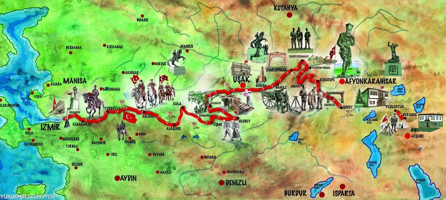 Güzergâh üzerindeki Atatürk Evi, müze ve şehitlik ziyaretlerinin ardından Dumlupınar’a yürüyecek ekip, Mustafa Kemal Paşa’nın “Ordular İlk Hedefiniz Akdeniz’dir, İleri” emriyle ulusun zaferini müjdelediği Zafertepe’de düzenlenecek etkinliklere de katılacak. Banaz, Uşak, Ulubey, Eşme, Kula, Alaşehir, Salihli, Ahmetli, Turgutlu ve Kemalpaşa’nın kurtuluş günü kutlamalarına katıldıktan sonra İzmir’e doğru ilerlemeye devam edecek kafilenin son durağı ise 9 Eylül sabahı Cumhuriyet Meydanı’nda düzenlenecek İzmir’in kurtuluş törenleri olacak. Yürüyüş kafilesi, Kocatepe, Zafertepe ve Dumlupınar şehitliklerinden bayrağa sardıkları hatıra toprağını da Cumhuriyet Meydanı’nda yükselen Atatürk Anıtı’nın toprağına katacak.