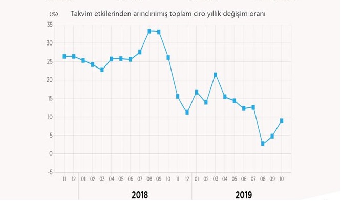 TÜİK, “Ekim 2019, Ciro Endeksleri”ni açıkladı. Buna göre, mevsim ve takvim etkilerinden arındırılmış toplam ciro endeksi ise bir önceki aya göre %0,5 arttı. Takvim etkilerinden arındırılmış sanayi ciro endeksi, 2019 yılı Ekim ayında bir önceki yılın aynı ayına göre %2,9 arttı. Mevsim ve takvim etkilerinden arındırılmış sanayi ciro endeksi ise bir önceki aya göre %0,5 arttı.